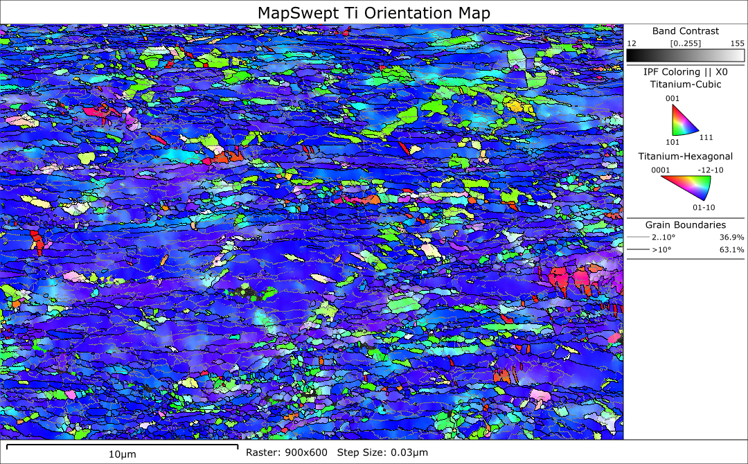 高度に変形した Ti サンプルの方位マップ。オリジナルのハフ指数付けでは、79% の指数付け率でした。MapSweeper のリファインスイープとリペアスイープを使用してデータを再処理した結果、最終的なヒット率は 99% となり、すべての測定点においてデータの質が大幅に改善されました。