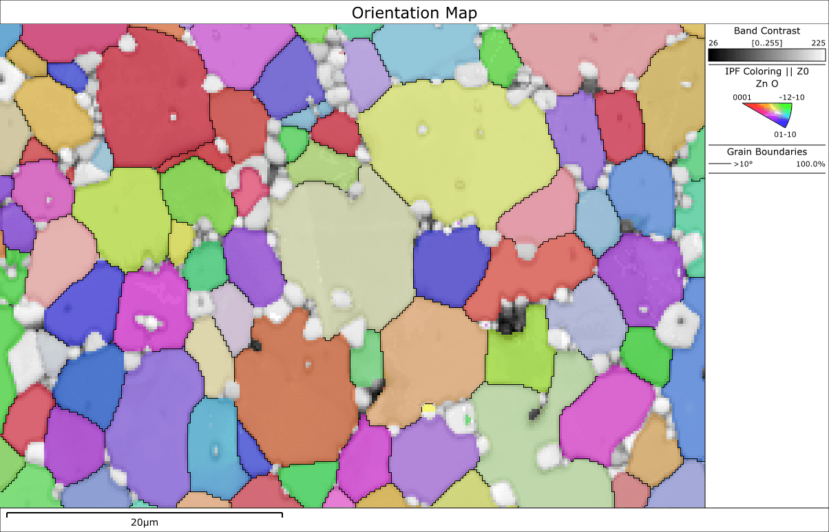 ZnO バリスタサンプルから取得した方位マップ。元のデータでは、個々の粒子の中に構造がないことが分かります。このデータは MapSweeper で再処理され、ZnO の非心対称性がリファインスイープでテストされました。最終的には、ほとんどの粒子に反転ドメイン粒界が存在し、ZnO の極性の変化が強調されていることが分かりました。サンプルおよびデータ提供:Grzegorz Cios博士、AGH University of Science and Technology、ポーランド、クラクフ。